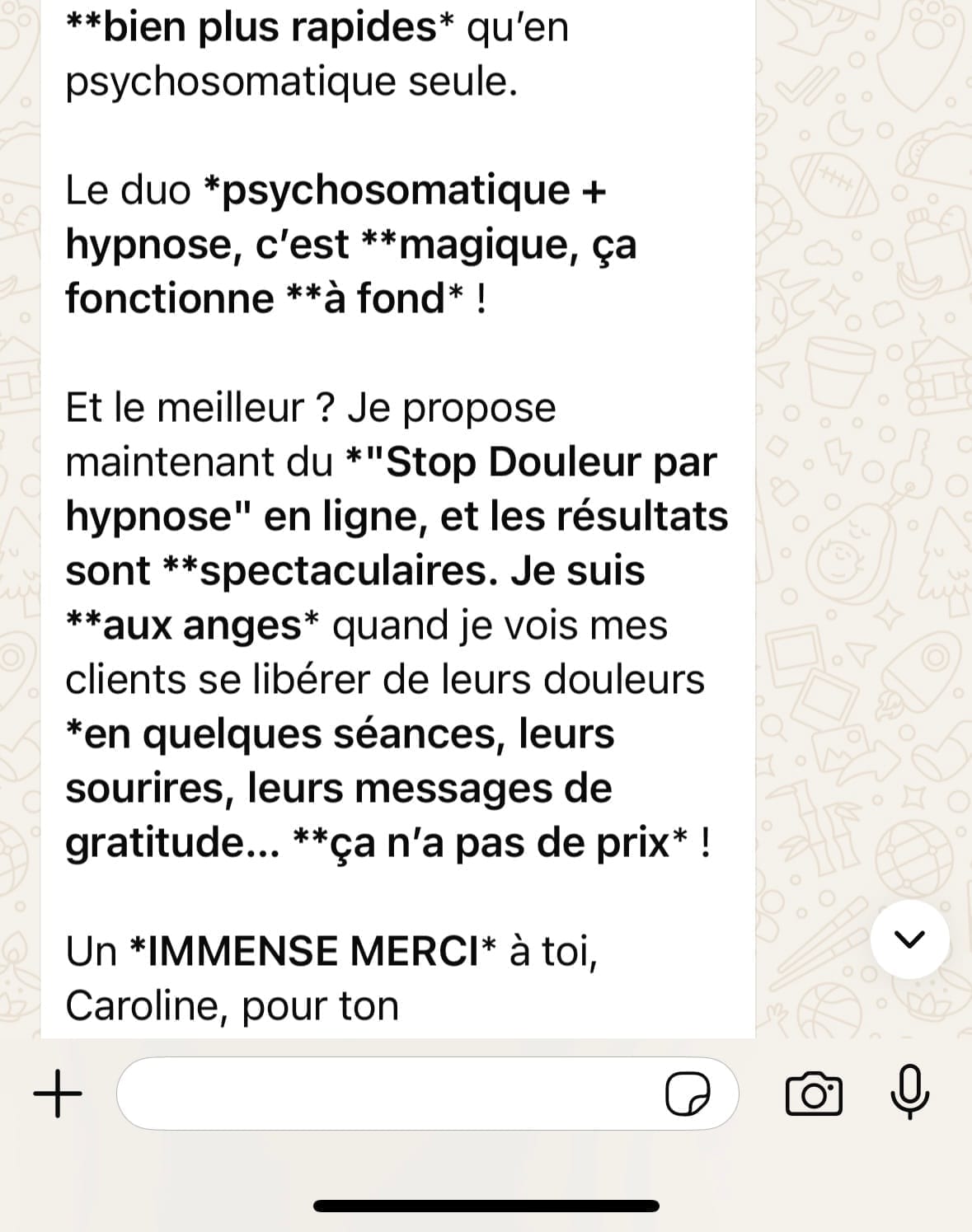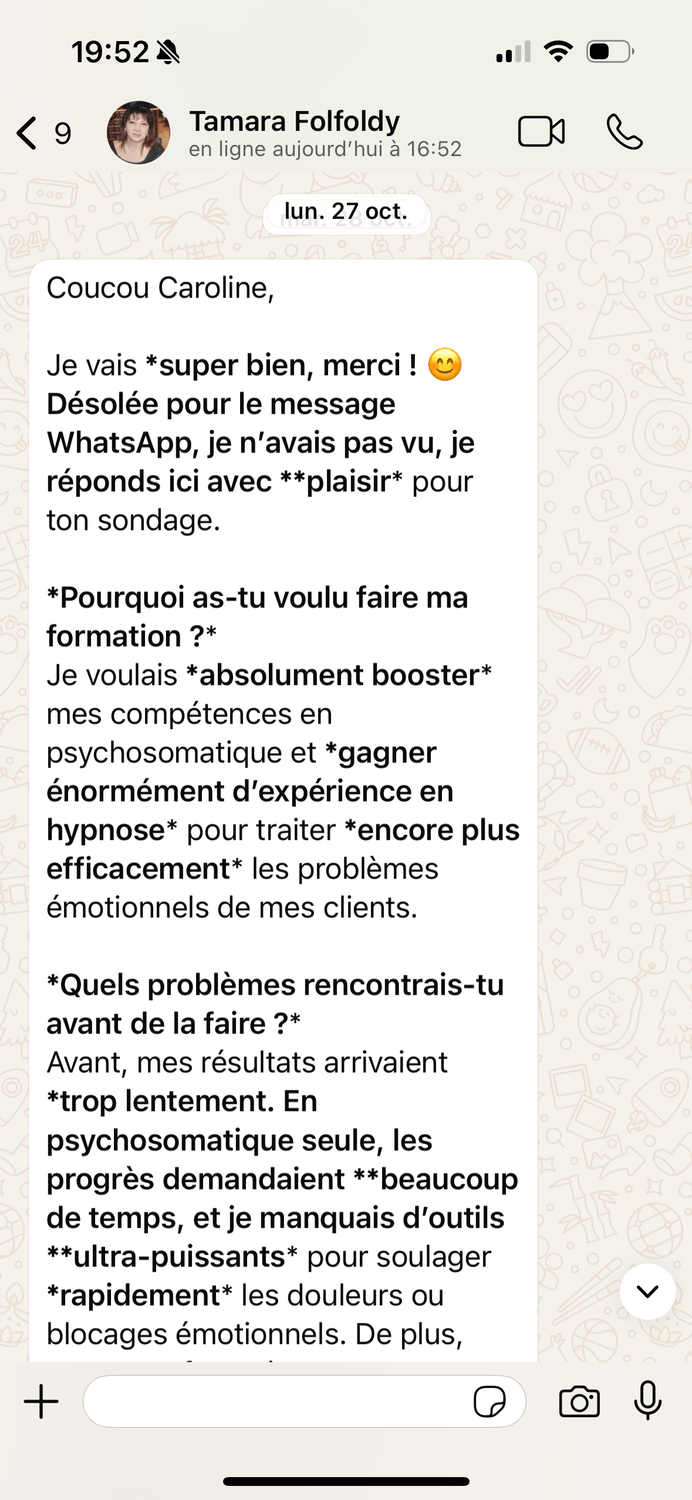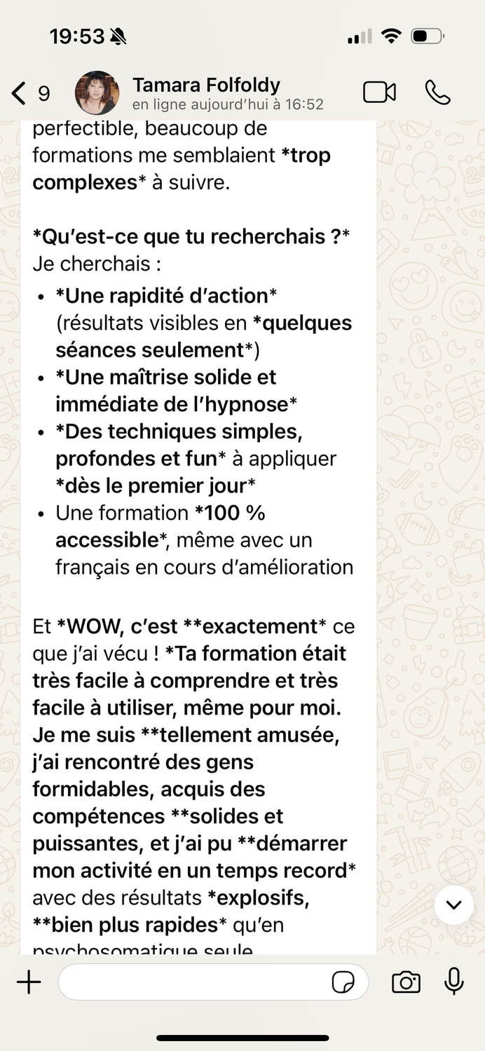 Grâce à des modules interactifs, des démonstrations pratiques et un accompagnement personnalisé, vous apprendrais à faire de l'hypnose sur mesure avec des outils bien spécifiques pour résoudre des problématiques complexes !